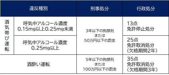 酒気帯び運転と酒酔い運転の罰則は、次の表を参考にしてください。