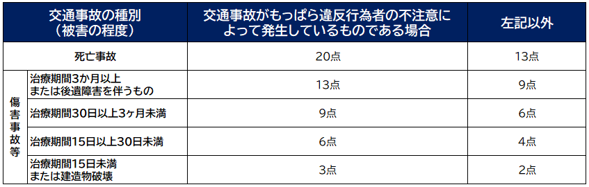 違反行為に対する付加点数は以下の表となります。