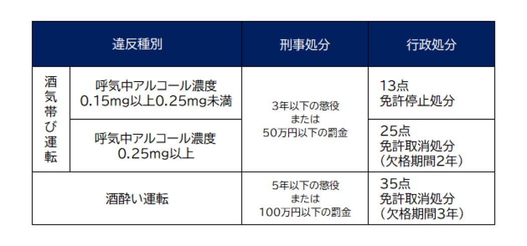 酒気帯び運転と酒酔い運転の罰則は、次の表を参考にしてください。