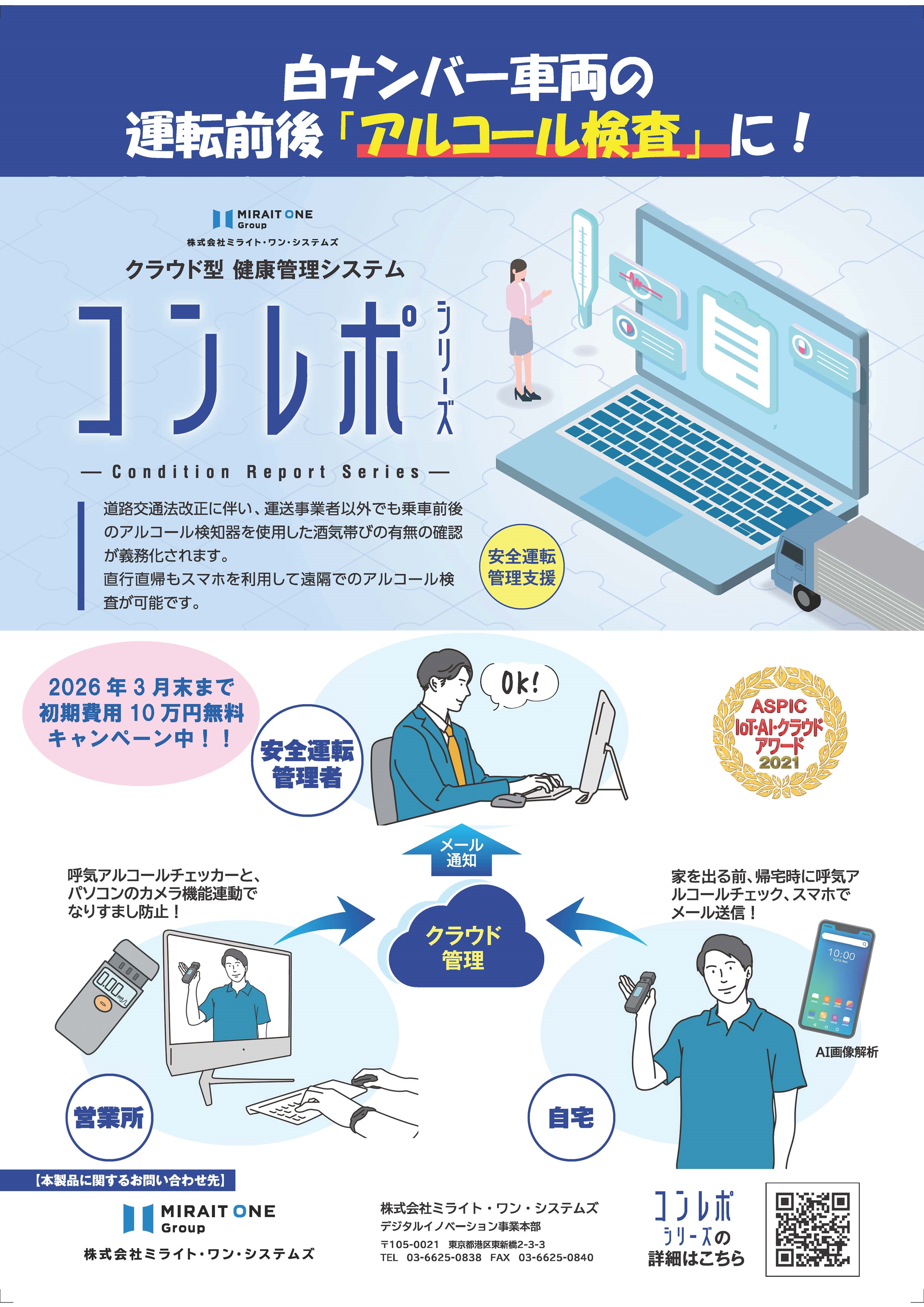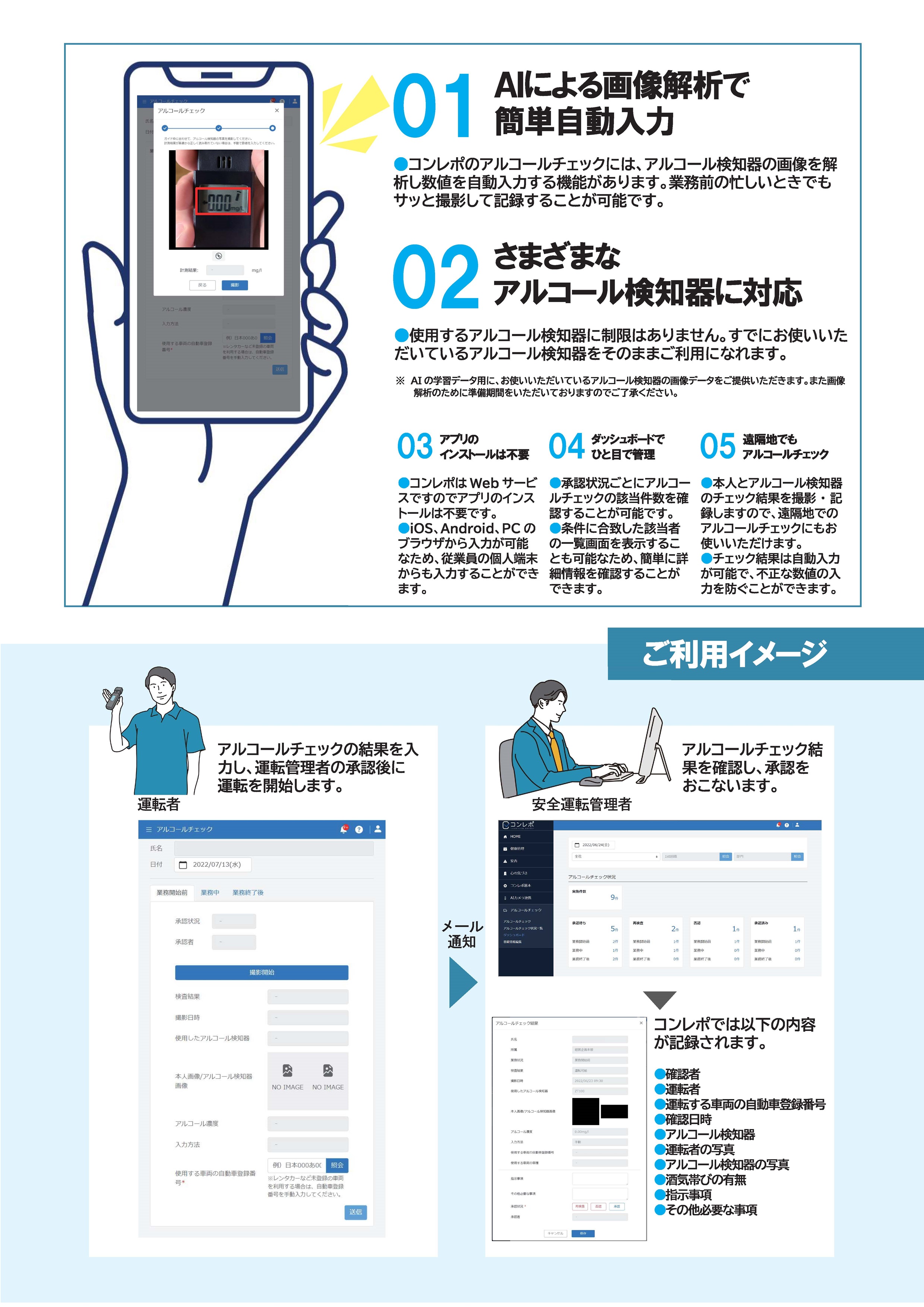 コンレポの「アルコールチェック連動サービス」は、運転管理業務に必須なアルコール検査記録を簡単に管理できるクラウドサービスです。専用アプリ不要のWebサービスで、PC・スマホ・タブレットから入力可能。出張先など遠隔地でのアルコールチェックにもお使いいただけます。AI画像解析による自動入力で不正を防止し、アルコールチェックの負担も軽減します。ソシアックの対応機種(SC-103,SC-202,SC-402,SC-502)は準備期間なく、直ぐに利用可能です。